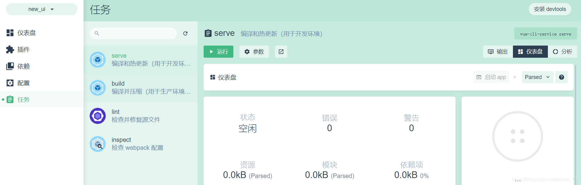 创建好项目后选择任务,在这里serve是我们开发期间打包和运行,build是成品发布运行,我们选择serve,点击运行即可成功启动项目