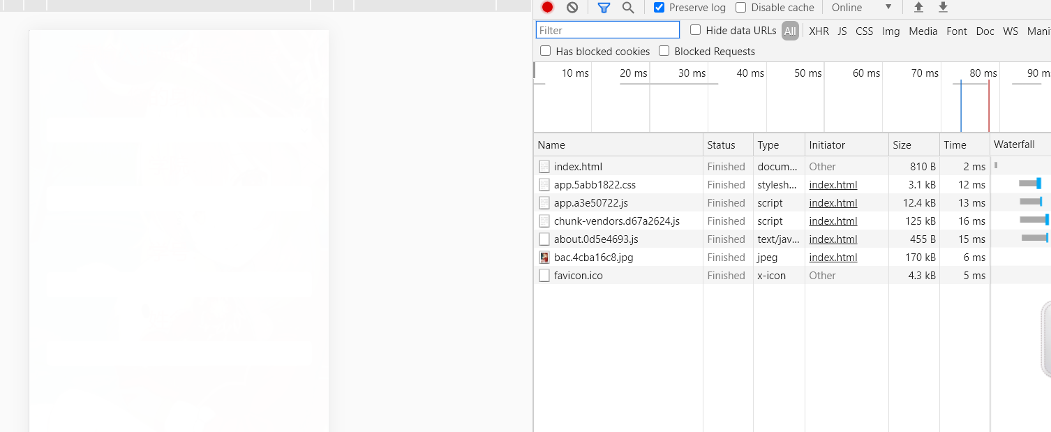 在开发模式下,使用命令npm run serve运行可以正常显示,但使用npm run bulid打包后打开index.html文件发现显示白屏,但是资源都能正常获取,其他页面也显示正常。