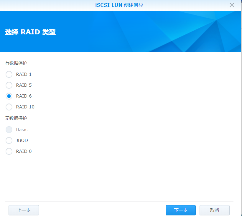 直接默认选项下一步,raid类型选择RAID6
