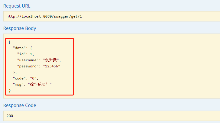 然后启动项目,在浏览器中输入 localhost:8080/swagger-ui.html 即可看到 swagger 接口文档页面,调用一下上面这个接口,即可看到返回的 json 数据。