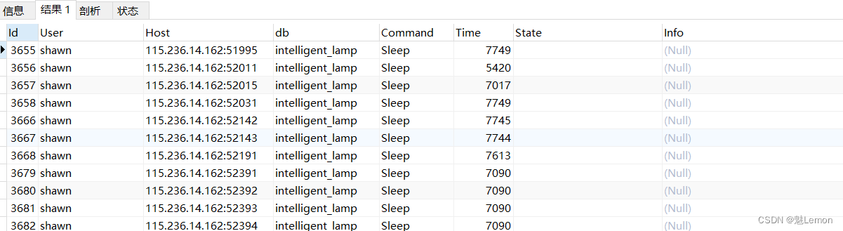 默认的mysql没有进行过优化,默认超时时间是28800秒,即8小时,而mysql的最大连接数默认是151个(上限为1000),当查询数量大于其最大连接数且没有超过默认时间时,后面的请求将无法响应,即会返回Too many connections错误信息,此时查询数据库show full processlist;可以发现大量的连接处于sleep状态